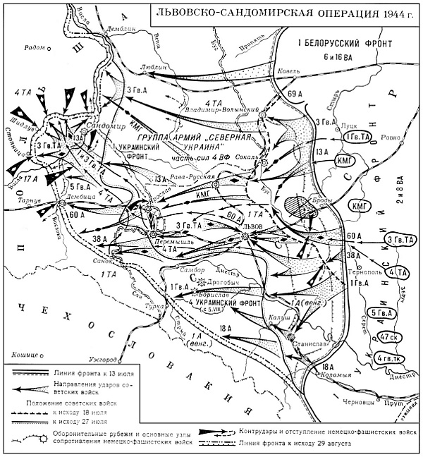 С 22 по 27 июля 1944 г. во Львове шли ожесточённые уличные бои между немецким гарнизоном (усиленным «пантерами» 8-й танковой дивизии вермахта) и передовым отрядом 10-го гвардейского Уральского Добровольческого танкового корпуса под командованием гв. полковника Фомичёва[11]. В ходе танковых боёв воинам 63-й гвардейской танковой бригады пришлось дважды очищать от гитлеровцев центральную часть Львова. Только к 27 июля советские войска при поддержке польских партизан заняли города Львов и Перемышль. На станиславском направлении части 1-й гвардейской и 18-й армии 24 июля заняли Галич, 27 июля — Станислав.