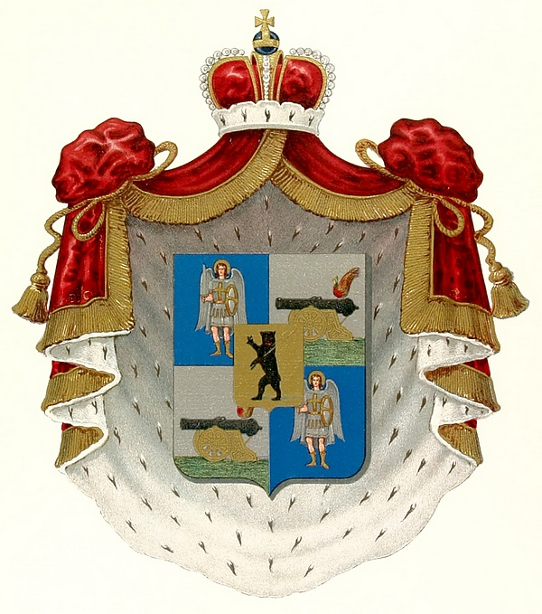 Щит разделён двумя перпендикулярными линиями на четыре части. В первой и четвёртой частях герб великого княжества Киевского: в лазоревом поле Ангел с сребротканой одежде, держащий в правой руке обнажённый серебряный меч, а в левой — золотой щит. Во второй и третьей частях герб княжества Смоленского: в серебряном поле на зелёной траве чёрная пушка на золотом лафете, а на пушке райская птица. Среди герба малый щиток, на нём герб княжества Ярославского: в золотом поле чёрный медведь, обращённый в правую сторону, стоящий на задних лапах и держащий на плече золотую секиру. Щит покрыт княжеской мантией и российской княжеской шапкой[4]