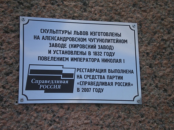 Статуи львов были установлены на Дворцовой пристани как украшение в 1832 году[1].