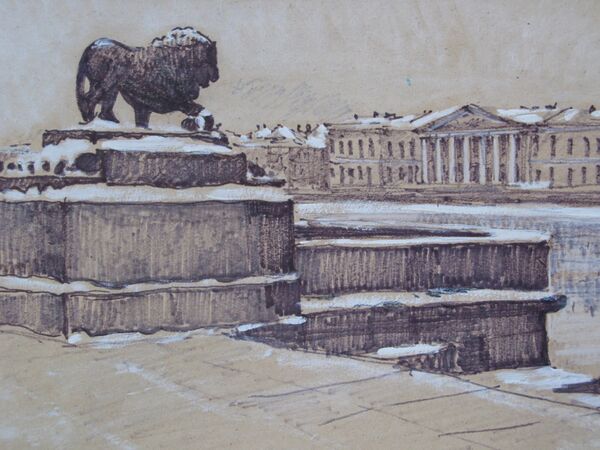 В 1901 году художница А. П. Остроумова-Лебедева создала иллюстрации к поэме А. С. Пушкина «Медный всадник». На одной из них (Лев и крепость), был изображён лев с дворцовой пристани. При этом были допущены две фактологические ошибки:
