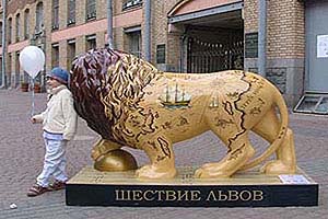 На период реставрации место скульптуры вначале заняла пластиковая копия — «солнечный» лев Бонифаций, расписанный участниками «Юношеской восьмерки». Впоследствии этот лев был продан на аукционе за 1,5 млн. рублей, деньги были перечислены на счета Научно-практического центра по оказанию помощи ВИЧ-инфицированным детям и беременным женщинам.