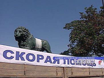 Вывоз льва на реставрацию был оформлен как театральное действо. «Врачи»-реставраторы в белых халатах осмотрели больного льва, они перебинтовали его и краном погрузили на «КАМАЗ», задрапированный под машину «Скорой помощи». На опустевшем постаменте льва заменили люди, одетые львами.[5]