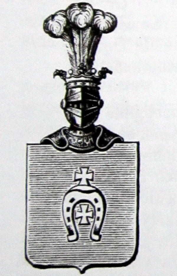 В поле лазоревом подкова серебряная, концами вниз обращённая, а внутри и на вершине подковы той — два кавалерских креста серебряных (либо золотых). Щит увенчан дворянским шлемом с дворянской короною и тремя страусовыми перьями. Намёт на щите лазоревый с серебром.