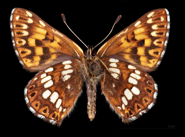 Размах крыльев особей, обитающих на территории России — 14—17 мм. На юге ареала размах крыльев самцов 29—31 мм, самок 31—34 мм. Крылья сверху рыжие с темным рисунком. Голова с глазами, покрытыми редкими и торчащими волосками. Усики с веретеновидной булавой. Нижняя сторона крыльев коричневого цвета, с красными пятнами, а на задних крыльях ещё и с белыми. Внешний край крыльев округлый. Центральные ячейки верхних и нижних крыльев замкнуты. Жилки R1, R2 не ветвятся; жилки R3, R4, R5 и М1 имеют общий ствол. К костальному краю переднего крыла выходят первых три жилки (R1, R2, R3), R4 выходит на вершину, а R5 и М1 — к внешнему краю