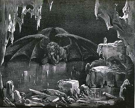 В это время появляются знаменитые художественные произведения по христианской тематике: в начале XIV века поэма «Божественная комедия» Данте[51], в 1654 году — «Люцифер» Вондела, в 1667 — «Потерянный рай» Милтона[52]. В «Божественной комедии» Люцифер описан как вмёрзший в лёд в самой глубине ада[53]. Он имеет 3 пасти[54], и там грызёт предателей и изменников, из которых величайшие — Иуда Искариот, Брут и Кассий[55].