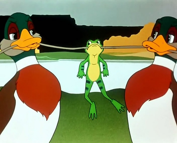 На болоте жила лягушка. Осенью утки, летевшие на юг, остановились у болота. От уток лягушка узнала про юг и захотела лететь с ними. Она попросила уток взяться за концы прутика клювами, чтобы лягушка, схватившись ртом за середину прутика, вместе со стаей попала на юг. Утки восхитились умом лягушки и согласились донести её до юга.