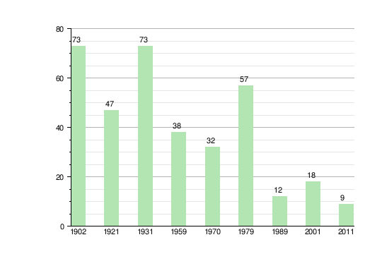 Согласно переписи 1921 года, здесь проживало 47 человек[6], все проживающие были католиками и заявили о польской национальности. В тот момент в деревне было 13 жилых домов. В 1931 году количество жилых домов повысилось уже до 16, а в деревне проживало 73 человека[7].