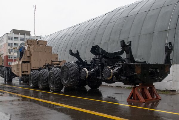 Первый опытный образец был собран на МАЗе в марте 1985 года и рассматривался как альтернативный вариант шасси по программе «Целина-2». Шасси должно было быть способно транспортировать ракету стартовой массой 104,5 т, длиной 22,6 м и диаметром 2,4 м в ТПК и оборудование, обеспечивающее хранение, транспортирование, подготовку и пуск ракеты.[1]