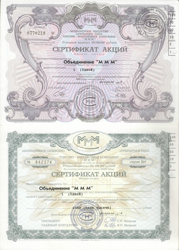 В 1993 году АООТ «МММ» зарегистрировало свой первый проспект эмиссии акций. Он позволял выпустить не более 991 тысячи акций. Акции номиналом 1 тысяча рублей, выпущенные в бумажной форме, начали продаваться 1 февраля 1994 года. С 7 февраля фирма ввела «двусторонние котировки» с определённой маржой на покупку и продажу собственных акций, которые постоянно росли. Это привело к тому, что они начали расходиться быстро, поскольку торговались с самого начала по принципу «сегодня всегда дороже, чем вчера», и руководство компании вскоре попыталось зарегистрировать второй проспект эмиссии, уже на миллиард акций. Минфин России, однако, разрешения на эмиссию не выдал. Остановки постоянно растущих цен объявленная компанией схема не предполагала. Мавроди вторично выпустил ещё 991 тысячу акций компании «МММ-фонды» и также их реализовал[9]. (недоступная ссылка)