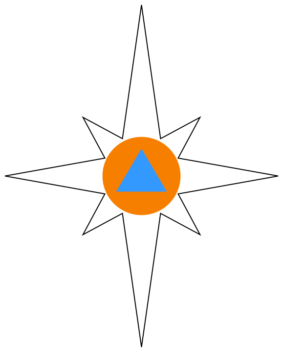 Малая эмблема МЧС России — вытянутая по вертикали звезда белого цвета с восемью лучами. В центре звезды в круге оранжевого цвета расположен равносторонний треугольник голубого цвета с основанием внизу(международная эмблема гражданской обороны). Утверждена Указом Президента Российской Федерации от 15 ноября 1997 г. № 1231 «О флаге и геральдическом знаке — эмблеме Министерства Российской Федерации по делам гражданской обороны, чрезвычайным ситуациям и ликвидации последствий стихийных бедствий»[48]. Используется на нарукавных и нагрудных знаках, ведомственных наградах, для маркировки техники и имущества.