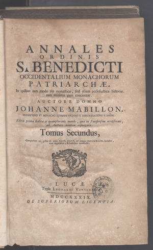 - «Annales ordinis S. Benedicti» (Париж, 1703—1739; Лукка, 1739—1745) — продолжение предыдущего издания, содержащее в себе жизнеописания не только святых, но и всех монахов-бенедиктинцев, действовавших на поприще христианской цивилизации.