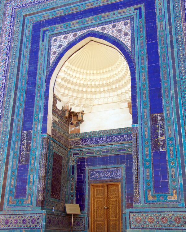 Как показывает декоративная керамика, найденная при раскопках, интерьер здания отличался исключительной роскошью. Внутренний строй декоративной отделки был построен на традиционном ярусном членении. Низ четверика опоясывала панель из крупных шестигранных майоликовых плит. Верх стен украшала расписная майолика с крупным условно растительным рисунком. Литые керамические сталактиты, найденные в большом числе при раскопках, дают представление о заполнении угловых арок переходного к куполу восьмерика. В цвете майолик преобладает темно-синий, много золота, нанесенного холодным способом. Горизонтальные и вертикальные плоскости сталактитовых рядов были построены на цветовом контрасте — прием совершенно оригинальный для ансамбля Шахи-Зинда. Темная полихромия вертикальных граней подчеркивалась светлой голубизной горизонтального ряда. Лента крупной (ширина 40-50 см), высокого рельефа арабской надписи, покрытой золотом по темно-синему фону, проходила, вероятно, в шестнадцатиграннике. Сталактитовая шарафа — в угловых пазухах восьмигранника. Характер найденного декора, цветовая палитра майолик, их сочная, яркая полихромная гамма, характер стилизованного растительного орнамента, выполненного в рельефной технике, находит много общего с хорезмийскими майоликами XIV века (надгробия Наджм ад-Дина), но более всего — с рядом стоящим мавзолеем «Безымянный-1» (усто Алима Насафи).