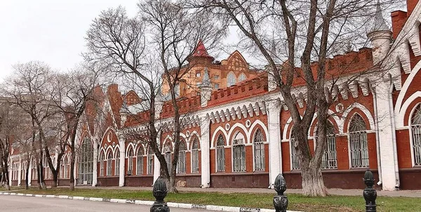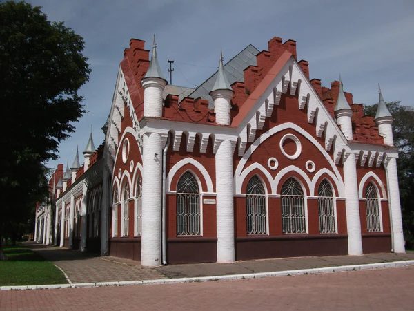 Одноэтажное здание с многощипцовой крышей и пинаклями пирамидальной формы в плане прямоугольное, вытянуто по оси «восток-запад» и выполнено в стиле кирпичной эклектики с преобладанием псевдоготических элементов. Расположено в районе исторической застройки центра города. Северным фасадом обращено к площади Победы, южным фасадом — к набережной реки Амур. Капитальные стены строения сложены из красного кирпича на известковом растворе. Поверхность фасадов сочетает неокрашенный кирпич, окрашенные в белый цвет декоративные элементы и фрагментарную штукатурку[1].