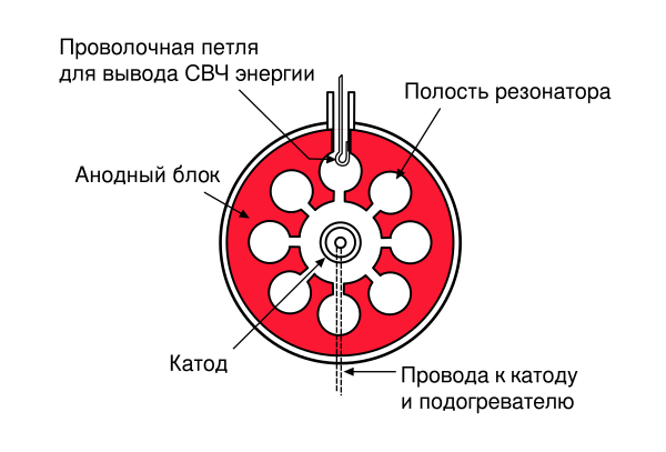 Магнетро́н — электронный электровакуумный прибор, величина протекающего тока в котором управляется электрическим и магнитным полем. Частным случаем реализации прибора (ставшим практически единственным) является вариант с выполнением анодного блока в виде резонаторных структур. Такая конструкция наделяет магнетрон способностью к генерации СВЧ-излучения при взаимодействии потока электронов с электрической составляющей сверхвысокочастотного поля в пространстве, где постоянное магнитное поле перпендикулярно постоянному электрическому полю[1].