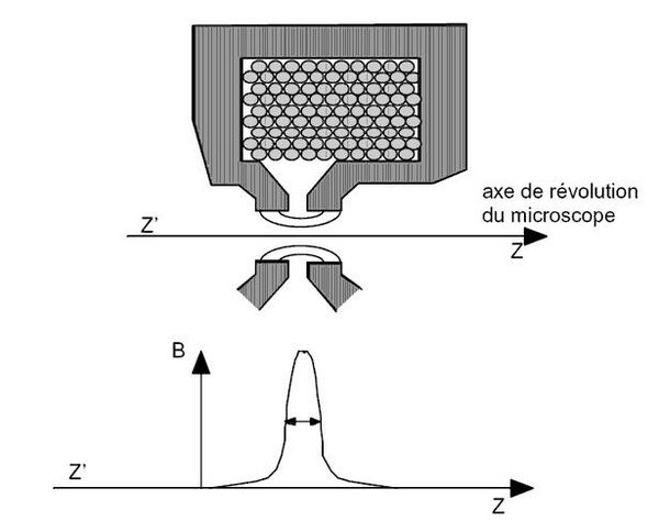 Боковое же движение убирается магнитной силой, когда электроны покидают поле, так что окончательным эффектом будет импульс, направленный к оси, плюс «вращение» относительно неё. Расходящиеся электроны собираются в параллельный пучок. Действие такого устройства подобно действию обычной оптической линзы на расходящиеся лучи света от находящегося в её фокусе объекта. Если поставить ещё одну такую же линзу, то она сфокусирует электроны снова в одну точку и получится изображение источника.