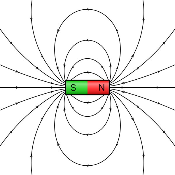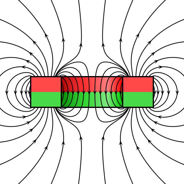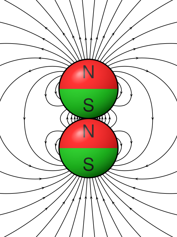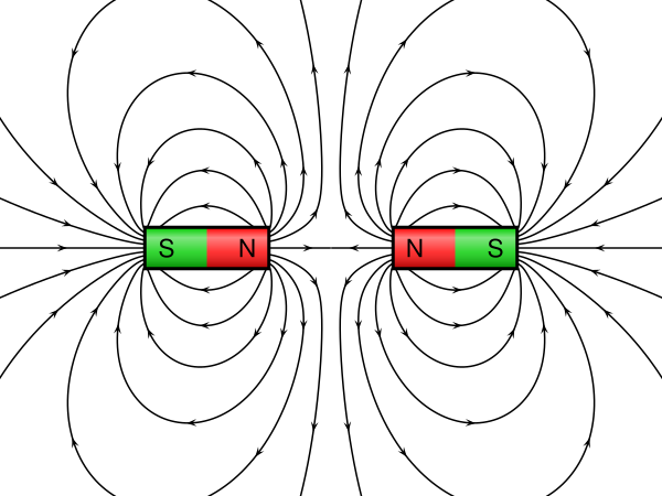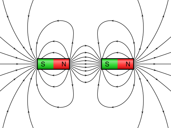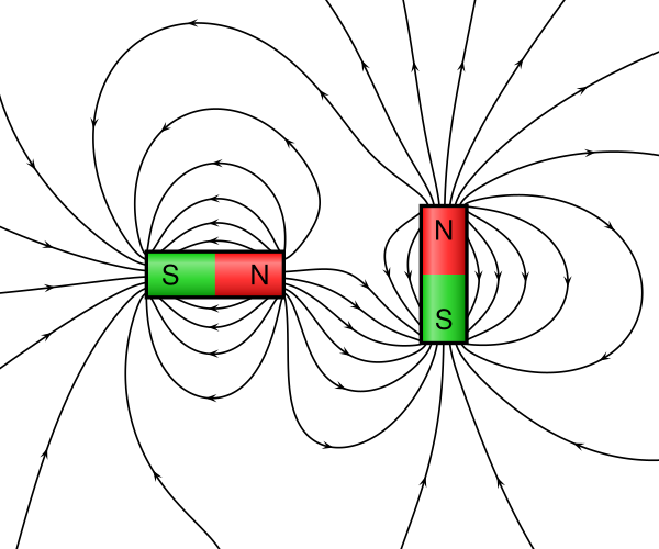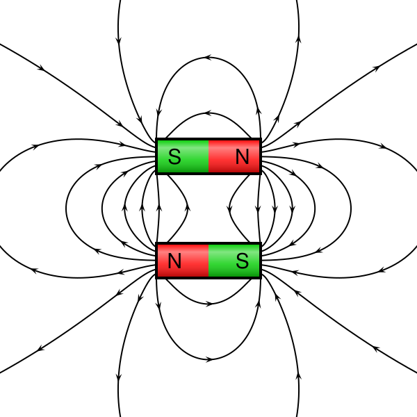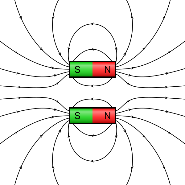 Схематичное изображение линий магнитного поля при взаимодействий двух магнитов в зависимости от расположения их полюсов (одинаковые полюса отталкиваются, разные — притягиваются):
