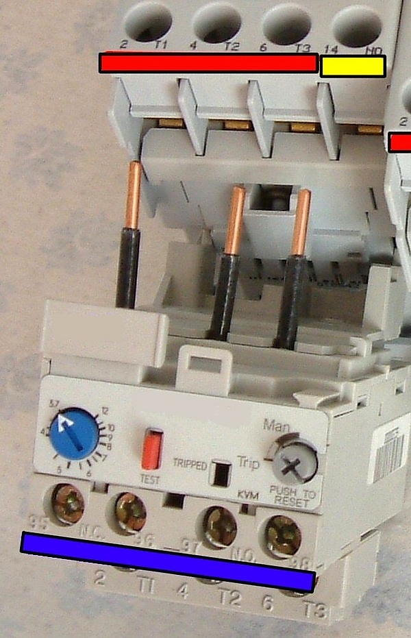 Магнитный пускатель, контактор или реле имеют силовые и блокировочные контакты. Силовые используются для коммутации мощной нагрузки; блок-контакты — в управляющей цепи. Силовой и блок-контакт может быть нормально разомкнутыми и нормально замкнутыми. Нормально открытый контакт в нормальном положении контактора разомкнут. Нормально закрытый контакт в нормальном положении контактора замкнут. Контакты контактора, пускателя или реле на принципиальных схемах показываются в нормальном положении[6].