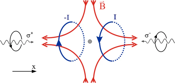 Магнито-оптическая ловушка является развитием первоначальной схемы Стива Чу по охлаждению атомов в оптической патоке. Охлаждение происходило в вакуумной камере, в области, в которой пересекались шесть лазерных охлаждающих пучков (по два вдоль каждой оси, часто получают при помощи 3 лазеров и 3 зеркал). Из-за действия силы тяжести охлажденные атомы быстро, за время порядка одной секунды, выпадали из охлаждаемой области. Для компенсации притяжения в установке при помощи двух соленоидов создавалось квадрупольное магнитное поле. Соленоиды размещаются соосно перед и после области патоки, в конфигурации, сходной с кольцами Гельмгольца. В отличие от схемы Гельмгольца ток в катушках течет в противоположных направлениях.