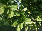 Почки опушенные, длиной около 1 см, диаметром 0,3 см. Листья узкоэллиптические, реже узкояйцевидные, длиной около 10—12 см, шириной 3,4—4 см, на вершине постепенно заострённые или тупые, с клиновидным основанием, сверху тёмно-зелёные, голые, снизу по средней жилке редко прижато опушённые. Черешки длиной 3—10 мм.