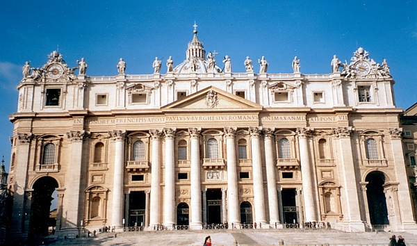 Значительна роль Карло Мадерны в строительстве собора Святого Петра. В 1607—1617 годах по указанию Павла V архитектор удлинил восточную ветвь креста — пристроил к центрическому зданию трёхнефную базиликальную часть, вернувшись таким образом от центрического плана Микеланджело к форме латинского креста, и создал новый главный, восточный фасад. Его ширина 114,69 метров и 45,55 метров в высоту[2]. Центральная часть оформлена восемью мощными колоннами коринфского ордера (нижний диаметр колонн 3 м!) с раскреповкой антаблемента, и неравными интерколумниями (расстояниями между осями колонн). Их сближение к центру и лёгкое выдвижение вперёд создаёт типично барочную «волну»[3]. Центральное окно фасада (высотой 7 м!) выходит на балкон, называемый Лоджией Благословений (Loggia delle Benedizioni), с которого Папа произносит апостолические послания лат. Urbi et Orbi (Городу и Миру). Мадерна также оформил нартекс (галерею), предваряющую вход в собор.