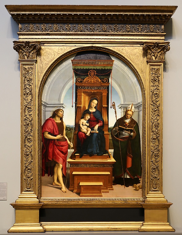 На картине изображена Дева Мария, восседающая на высоком деревянном троне без подлокотников и с нереалистично крутыми ступенями с младенцем Иисусом на коленях. Она полностью поглощена чтением со своим сыном, доверительно прильнувшим к ней. Надпись над престолом Мадонны гласит: «Славься, Матерь Христова» (SALVE MATER CHRISTI). Справа от трона стоит Иоанн Креститель, задумчиво устремивший взгляд в небеса, слева — читающий Николай Чудотворец в епископском облачении. Изолированные фигуры Марии, Иоанна и Николая не взаимодействуют друг с другом, что было свойственно стилю художников умбрийской школы, в особенности Перуджино[1]. На фоне изображён белый арочный свод и далёкий пейзаж за ним под голубым небом. У ног Святого Николая лежат три шара, которые могут символизировать Пресвятую Троицу или три мешка с золотом, которые он по преданию подбросил трём дочерям обнищавшего жителя Миры, чтобы спасти их от бесчестья[2].