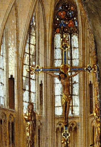 Все оконные проёмы остеклены прозрачными стёклами, что нетипично для соборов тех времён[4]. На единственном окне с видимой верхней частью в глубине собора изображён витраж с узором из красных и синих цветов, словно распустившихся над деревянной статуей распятого Христа[4]. По мнению искусствоведа Джона Уорда этот витраж (что примечательно, отсутствующий в сохранившихся копиях картины) символизирует возрождающееся Древо Жизни из Книги Бытия. Идея могла быть позаимствована у Мазаччо, на картине «Распятие» которого изображён куст, вырастающий из креста над головой Иисуса[25].
