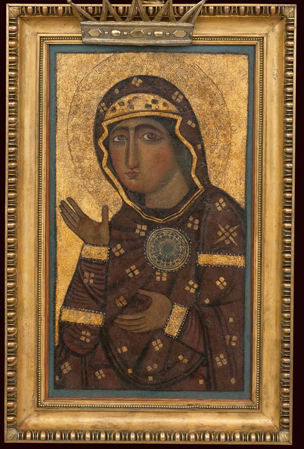 Икона, по всей вероятности, имеет Византийское происхождение. Считается, что она была привезена в Рим в 977 году митрополитом Сергием Дамасским, бежавшим от агарян. До этого образ находился долгое время в Эдессе в Храме Пресвятой Богородицы, являя там верующим массу чудес, согласно церковным преданиям, в связи с чем получил широкую известность как Эдесский чудотворный образ Божьей Матери. С этой иконой переплелась судьба одного из самых почитаемых на Руси святых — Святого Алексия, Человека Божия.