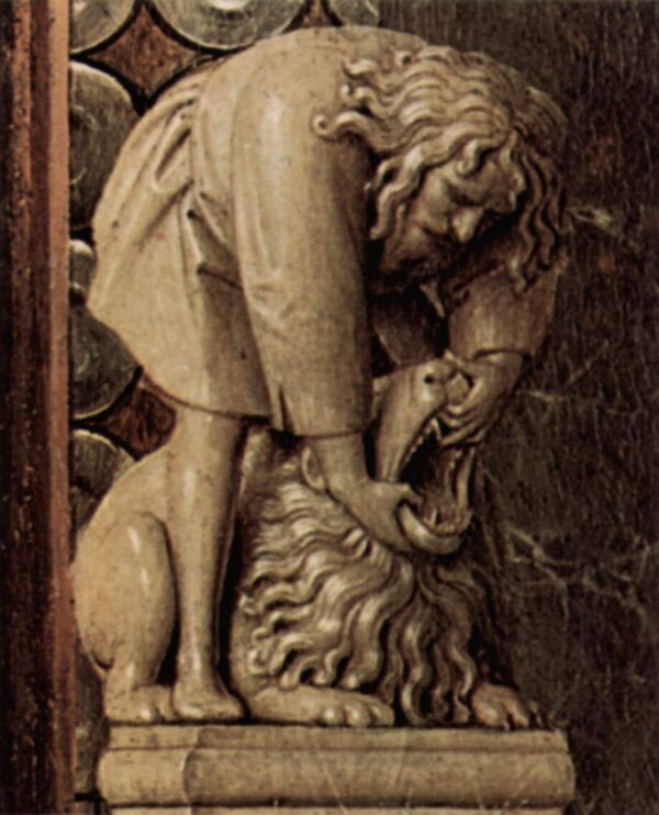 На стойках подлокотников престола изображены резные фигурки Адама и Евы, на самих подлокотниках — сцены убийства Авеля Каином и Самсона, разрывающего пасть льву. На капителях колонн изображены сцены из Ветхого Завета, например встреча Авраама с Мелхиседеком и жертвоприношение Исаака[29].