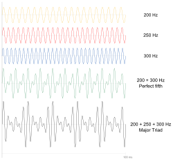 Мажорное трезвучие является консонантным, так как возникает в результате деления совершенного консонанса (квинты) согласно отношениям арифметической пропорции (4:5:6, большая терция + малая терция)[5].