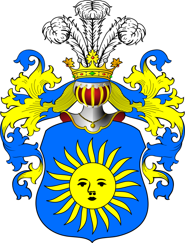 Щит лазоревого цвета поделён на четыре части золотым с широкими концами крестом. В первой и четвёртой частях золотое с человеческим лицом солнце. Во второй и третьей частях выходящее из боков щита стропило, состоящее из золотого, червлёного, чёрного и серебряного цветов. Под ним раскрытая серебряная книга.