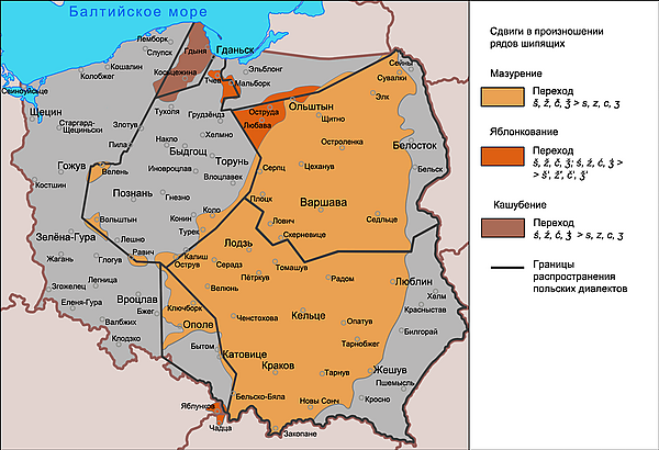 В мазовецких немазуракающих говорах (любавских, острудских и варминских говорах мазовецкого диалекта, исключая говоры западной Вармии), а также в мальборских говорах великопольского диалекта отмечается фонетическое явление, связанное, как и мазурение, со сдвигом в произношении рядов шипящих (ряды š, ž, č, ǯ и ś, ź, ć, ʒ́ совпадают в одном ряду š, ž, ć, ʒ́, или š’, ž’, č’, ǯ’)[2]. Для мальборских и восточновармийских говоров характерен ряд š, ž, ć, ʒ́, для любавских и острудских — š’, ž’, č’, ǯ’[10][11]. Сходное явление отмечается в южном ареале силезского диалекта на границе Польши с Чехией и Словакией (в районах Яблункова в Тешинской Силезии и в районе Чадцы в северо-западной Словакии — в яблунковском и чадецком говорах), где ряды š, ž, č, ǯ и ś, ź, ć, ʒ́ совпадают как в мальборских и восточновармийских говорах в š’, ž’, č’, ǯ’[12]. Данное изменение в произношении рядов шипящих получило название «сяканье» (либо «шяканье», польск. siakanie), или яблонкование (по названию города Яблункова в южносилезском ареале этого явления)[13]. Если ранее яблонкование часто рассматривалось как результат смешения словацкой и польской консонантных систем, так считал, в частности, К. Нич, то в настоящее время яблонкование считается исконно польским явлением (частным случаем смешения рядов s, z, c, ʒ — š, ž, č, ǯ — ś, ź, ć, ʒ́). Исключение может составлять чадецкий говор, в котором сдвиг в произношении шипящих появился, вероятнее всего, под влиянием словацкого языка[12][14].