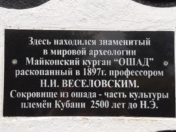 Был исследован в 1897 году экспедицией археолога Н. И. Веселовского. Находки из Майкопского кургана находятся в Эрмитаже. Раскопки данного кургана положили начало исследованиям майкопской археологической культуры. В настоящее время кургана Ошад не существует. Его остатки были уничтожены в начале XX века. Сейчас это место отмечает воздвигнутый в 1972 году скромный памятник, изготовленный скульптором А. А. Шикояном, в виде белой стелы, на которой изображена фигура древнего человека, помещены 7 медальонов с предметами из кургана Ошад и надпись золочёными буквами: «Здесь находился знаменитый в мировой археологии Майкопский курган „Ошад“, раскопанный в 1897 г. профессором Н. И. Веселовским».