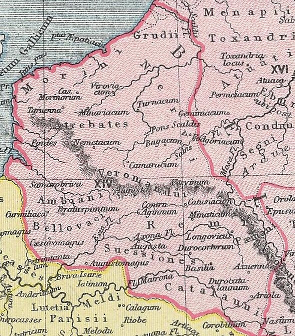 Он участвовал во многих сражениях в Галлии (см. карту провинции): на Рейне (лат. Rhenus), Араре (лат. Arar), Родане (лат. Rhodanus), Мозе (лат. Mosa), Матроне (лат. Matrona, Materna), Секване (лат. Sequana), Леде (лат. Ledus), Клитисе[11] (лат. Clitis), Эларисе (лат. Elaris), Атаксе (лат. Atax), Вахалисе (лат. Vachalis), Лигере (лат. Liger)[12].