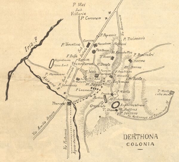 Марий Аваншский называет место убийства: «был убит на реке Ире[47]»[42], очевидно, ссылаясь на данные из «Хроники» Марцеллина Комита[48] или труда «О происхождении и деяниях гетов» Иордана[35]. Упомянутая река Ирия протекает через Дертону (см. карту города).