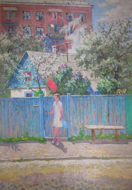 На картине изображён тротуар, вдоль которого тянется забор с калиткой, над которой развевается красный флаг. Перед калиткой стоит девочка, держащая в руке синий шарик. За забором расположен одноэтажный дом, окружённый деревьями, а на заднем плане возвышается многоэтажный жилой дом. Композиция построена с использованием преобладания сине-голубых, зелёно-коричневых и красно-белых оттенков.