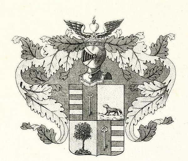 Щит разделён на четыре части, из которых первая и четвертая, разрезанные перпендикулярно надвое, имеют голубое и красные поля. В них изображены: на голубом поле в верхней - с правой стороны, а в нижней - с левой стороны по три золотые полосы, а на красном поле - по одному золотому ключу. Во второй части в золотом поле - идущий по земле направо бобр. В третьей части в золотом же поле поставлено дерево Ива. Щит увенчан дворянскими шлемом и короною, на поверхности которой видны два чёрных орлиных крыла и между ними серебряное сердце с пламенем. Намёт на щите золотой, подложенный голубым[5].