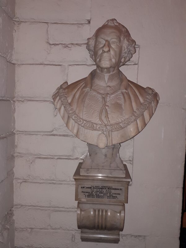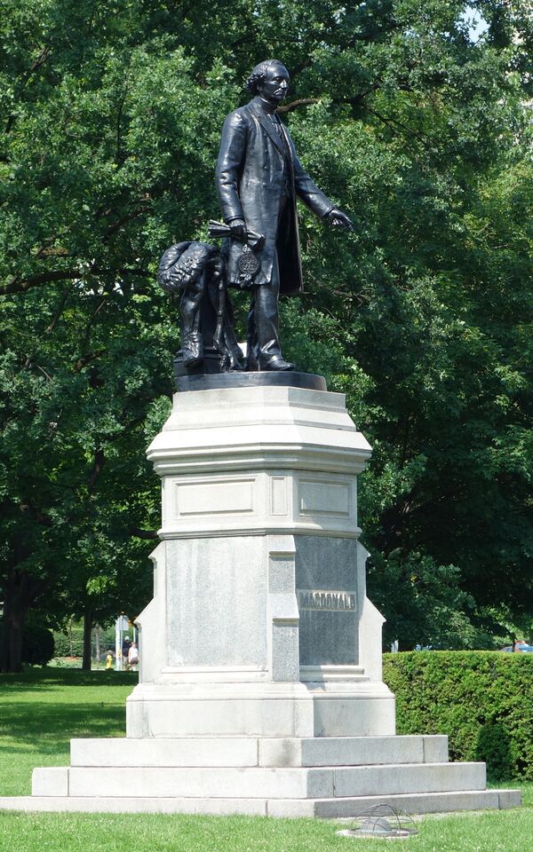 Уже в ноябре 1892 года, через полтора года после смерти Макдональда, в соборе Святого Павла в Лондоне был установлен его мраморный бюст[34]. В самой Канаде первый памятник ему был воздвигнут в 1893 году в центре Гамильтона (Онтарио) на общественные пожертвования. К октябрю 1895 года к нему добавились ещё три монумента в Торонто, Монреале и Кингстоне, тоже установленные на собранные пожертвования[334]. В отличие от них, на памятник, воздвигнутый в июле 1895 года в Оттаве, правящая партия выделила 10 тысяч долларов из государственной казны, несмотря на возражения либеральной оппозиции. Либералы требовали, чтобы и этот монумент возводился на частные пожертвования или чтобы аналогичная сумма была выделена на памятник недавно умершему Александру Маккензи[335].