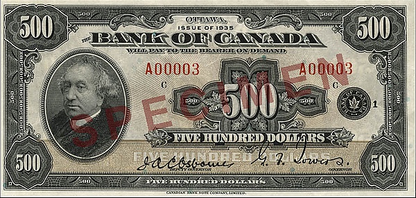 В 1935 году была выпущена единственная в истории Канады серия банкнот достоинством в 500 долларов. На ней была размещена гравюра, изображающая первого премьера[347]. С 1971 года выпускалась купюра достоинством 10 долларов с портретом Макдональда[348]. Хотя дизайн банкноты несколько раз менялся, портрет первого премьер-министра оставался его неотъемлемой частью. На банкнотах этого же достоинства специальной серии, вышедшей в 2017 году, были сразу четыре портрета — рядом с Макдональдом изображены Картье, первая женщина в Палате общин Канады Агнес Макфейл и первый сенатор-абориген Джеймс Гладстон[349]. После того, как с 2018 года на десятидолларовой банкноте начали размещать изображение правозащитницы Виолы Десмонд, планируется перенос портрета Макдональда на купюру более высокого достоинства[348].