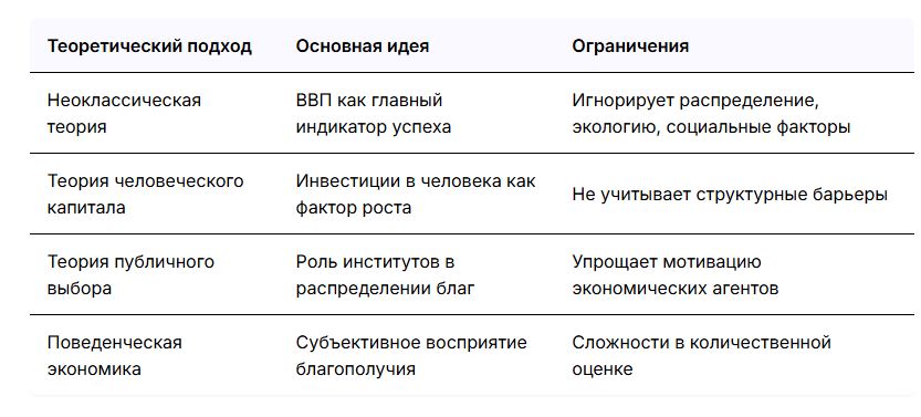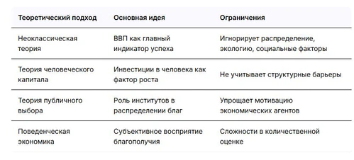 Сравнительный анализ ключевых теоретических подходов к оценке благосостояния показывает, что традиционные макроэкономические показатели (например, ВВП) являются необходимым, но недостаточным условием для повышения качества жизни. Чтобы экономический рост превратился в реальное качество жизни, нужны работающие законы, честные суды и продуманная социальная политика государства[6].