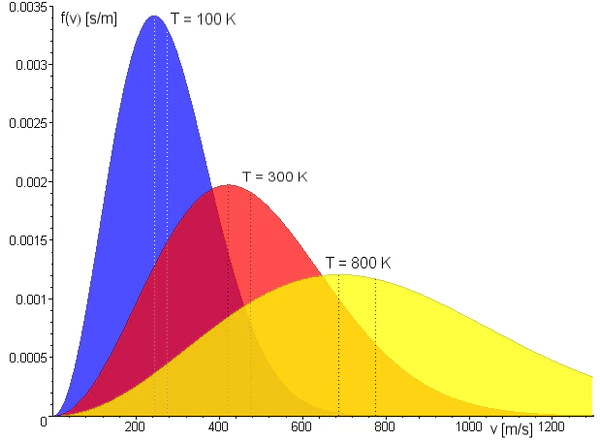 Другим основным научным занятием Максвелла в это время стала кинетическая теория газов, основанная на представлениях о теплоте как роде движения частичек газа (атомов или молекул). Максвелл выступил в качестве продолжателя идей Рудольфа Клаузиуса, который ввёл понятия средней длины свободного пробега и средней скорости молекул (предполагалось, что в состоянии равновесия все молекулы имеют одну и ту же скорость). Клаузиус же ввёл в кинетическую теорию элементы теории вероятностей[45]. Максвелл решил заняться этой темой после прочтения работы немецкого учёного в выпуске журнала Philosophical Magazine за февраль 1859 года, первоначально имея целью опровергнуть взгляды Клаузиуса, но затем признал их заслуживающими внимания и развития. Уже в сентябре 1859 года Максвелл выступил на заседании Британской ассоциации в Абердине с докладом о своей работе. Результаты, содержавшиеся в докладе, были опубликованы в статье «Пояснения к динамической теории газов» (Illustrations of the Dynamical Theory of Gases), вышедшей в трёх частях в январе и июле 1860 года. Максвелл исходил из представления о газе как об ансамбле множества идеально упругих шариков, хаотически движущихся в замкнутом пространстве и сталкивающихся друг с другом. Шарики-молекулы можно разделить на группы по скоростям, при этом в стационарном состоянии число молекул в каждой группе остаётся постоянным, хотя они могут менять скорость после столкновений. Из такого рассмотрения следовало, что в равновесии частицы имеют не одинаковую скорость, а распределяются по скоростям в соответствии с кривой Гаусса (распределение Максвелла). С помощью полученной функции распределения Максвелл рассчитал ряд величин, играющих важную роль в явлениях переноса: число частиц в определённом диапазоне скоростей, среднюю скорость и средний квадрат скорости. Полная функция распределения вычислялась как произведение функций распределения для каждой из координат. Это подразумевало их независимость, что многим тогда казалось неочевидным и требовало доказательства (оно было дано позже).[46][47][48]