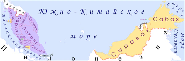 - Восточная Малайзия (традиционное название — Сабах и Саравак)[7][9][10] занимает северную часть острова Калимантан с прилегающими островами, граничит с Брунеем на севере и с Индонезией на юге[11][12], имеет также морскую границу с Филиппинами.