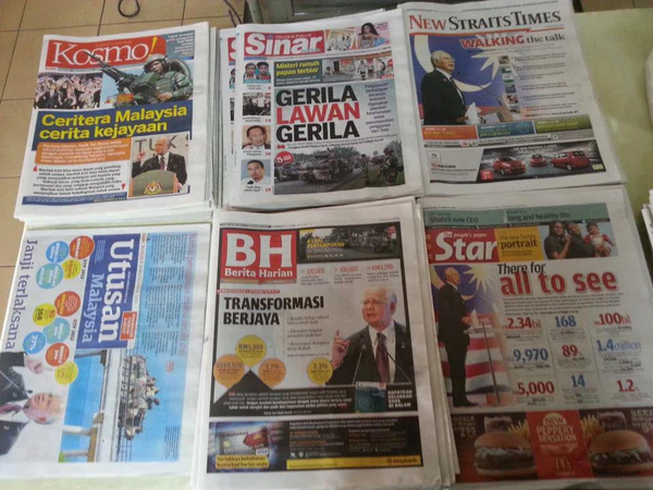 Выпускается 56 газет (14 на малайском языке, 12 — на английском, 18 — на китайском, 4 — на тамильском, 4 — на японском и 4 — многоязычные) и 1 801 периодическое издание (959 на малайском языке, 495 — на английском, 255 — на китайском, 62 — на тамильском и 30 — на японском). С 2006 года выходит ежеквартальный театральный журнал «Пёнтас» (Сцена), редактором которого является известный поэт Рахимидин Захари. Крупнейшими газетными синдикатами являются «Нью Стрейтс Таймс Пресс» (1961), издающий пять ежедневных («Нью Стрейтс Таймс», «Берита Хариан», «Бизнес Таймс», «Мэлэй Мейл», «Хариан Метро») и четыре воскресных газеты («Нью Санди Таймс», «Берита Минггу», «Санди Мейл», «Метро Ахад») общим тиражом свыше 1,5 млн экземпляров и восемь журналов, а также «Утусан Мелайю (Малайсиа) Берхад» (1938), выпускающий две ежедневных («Утусан Малайсиа» — на латинице, «Утусан Мелайю» — на арабице) и одну воскресную («Минггуан Малайсия») газету общим тиражом около 700 тыс. экземпляров и десять журналов. Среди других влиятельных газет: «Стар» с воскресным номером «Санди Стар» (тираж 170 тыс.), «Наньян Шанбао» (145 тыс.), «Синчжоу Жибао» (210 тыс.), «Тамил Несан» (30 тыс.), «Чжунго Бао» (110 тыс.). Лицензии на печатные издания обновлялись до 2012 г. ежегодно. С 1974 г. существует Малайзийский институт прессы, где журналисты повышают свою квалификацию.