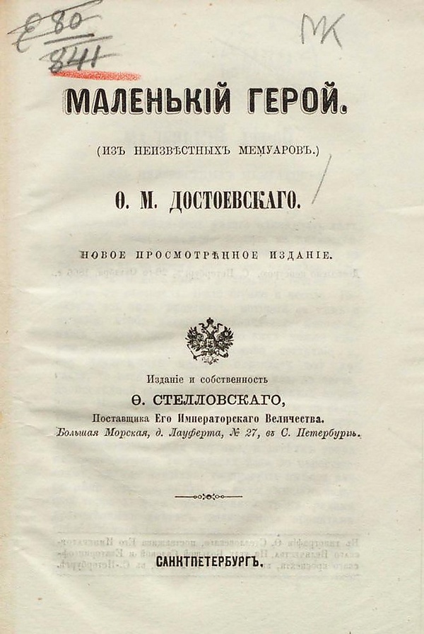 Намереваясь в 1856 году получить разрешение печатать свои новые произведения, ссыльный писатель, тем не менее, интересовался печатной судьбой своего прежнего рассказа: «Я, милый мой, спрашивал тебя об участи „Детской сказки“. Скажи мне положительно <…> хотели ли её серьёзно печатать? Если хотели, то пробовали иль нет, а если не пробовали, то почему именно? Ради Бога, напиши мне это всё. Эта просьба моя будет ответом на твоё предположение, что мне не запрещено печатать. Согласись, что судьба этой вещицы „Детской сказки“ для меня интересна во многих отношениях». Таким образом, автора интересует даже не столько публикация «Маленького героя», сколько сам факт разрешения вернуться в литературу и печататься обычным образом. Завершённый рассказ своего ссыльного брата Михаил Достоевский опубликовал в августе 1857 года, в журнале «Отечественные записки», под названием «Маленький герой» (Из неизвестных мемуаров). Вместо фамилии автора под произведением стояла анаграмма М-ий. Изменение заглавия, по всей видимости, с автором согласовано не было и было вызвано стремлением отвести глаза властям от подлинного авторства произведения[2].