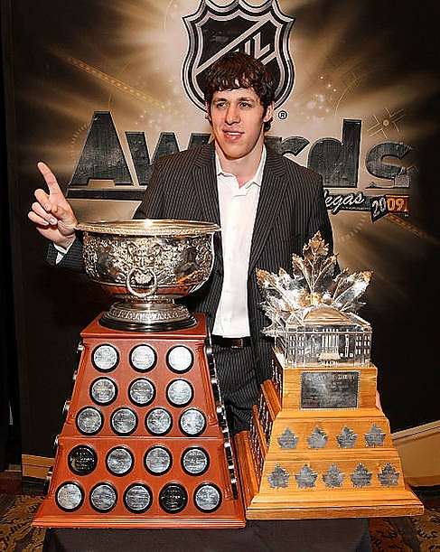 Сезон 2008/2009 стал для Евгения одним из наиболее успешных в карьере. В регулярном чемпионате НХЛ он набрал 113 очков, став лучшим бомбардиром лиги и получив «Арт Росс Трофи»[51]. На матче всех звёзд победил в соревновании на точность броска и сыграл в стартовой пятёрке[52]. В финале Кубка Стэнли «Питтсбургу» удалось взять реванш у «Детройта». Малкин стал лучшим бомбардиром плей-офф, набрав 36 очков в 24 матчах, и первым из российских игроков получил «Конн Смайт Трофи»[53].