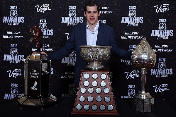 В сезоне 2011/2012 стал лучшим бомбардиром лиги, набрав 109 очков и впервые в своей карьере преодолел рубеж в 50 заброшенных шайб за один регулярный чемпионат. По итогам сезона Малкин получил призы «Арт Росс Трофи», «Харт Трофи» и «Тед Линдсей Эворд»[56]. В своём третьем матче всех звёзд НХЛ играл в составе команды Здено Хары.