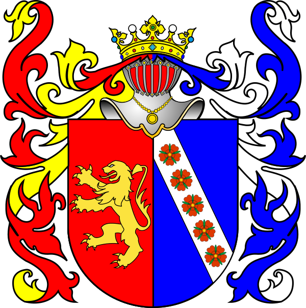 Щит напол-разделенный; в правом красном поле золотой лев, вправо; в левом же, голубом, пять роз на серебряной перевязи, влево. В навершии шлема дворянская корона.