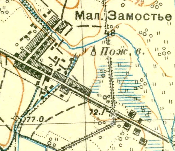 ЗАМОСТЬЕ МАЛОЕ — деревня удельная при колодцах, число дворов — 18, число жителей: 69 м. п., 74 ж. п. (1862 год)[12]