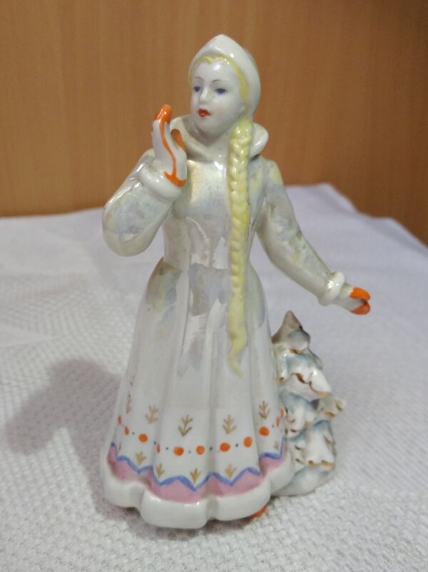 В более распространённом варианте Снегурочка предстаёт в образе, сформировавшемся в СССР после появления новогодних ёлок в 1930-х годах. У неё длинная коса, правая рука приподнята. На лице Снегурочки улыбка, она словно к чему-то прислушивается. Росписи статуэток варьировались в зависимости от времени и художника. Как правило, полихромная роспись дополнялась золотом. Эти статуэтки Дулёвский фарфоровый завод продолжает изготавливать и в 2020-х годах, однако современная роспись выполняется более простым способом с использованием люстра[1].