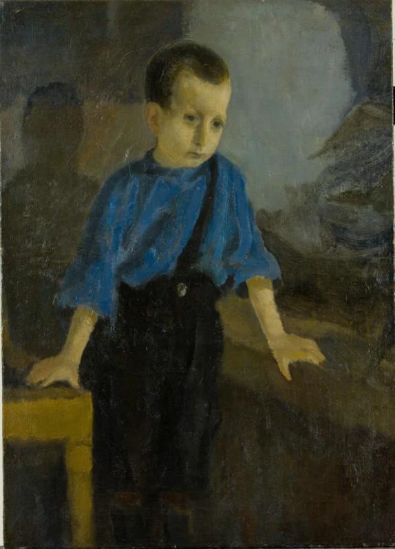 В центре композиции изображён мальчик в полный рост, одетый в синюю рубашку и чёрные штанишки, через левое плечо которого перекинута чёрная лямка. Голова мальчика слегка склонена на левое плечо и повернута в три четверти влево относительно зрителя. Его коротко остриженные тёмные волосы и бледное лицо подчёркивают выразительность образа. Ладони обеих рук опущены вниз и опираются на предметы, не уточнённые в описании. Фон картины условный (фон (изобразительное искусство)), от фигуры мальчика влево падает тень. В работе преобладают голубовато-серые оттенки в цветовой гамме.