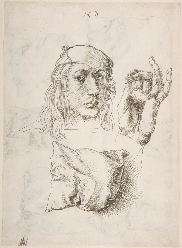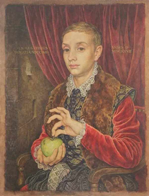 Мальчик изображён сидящим в кресле, что несколько выбивается из традиции ренессансного портрета — таким образом обычно изображались женщины. Его светлые волосы коротко острижены, костюм сшит из бархата и парчи. На стене, частично закрытой бархатным занавесом, приколота записка. Двумя пальцами левой руки мальчик держит за черенок зелёное яблоко и опускает плод в ладонь правой[1].